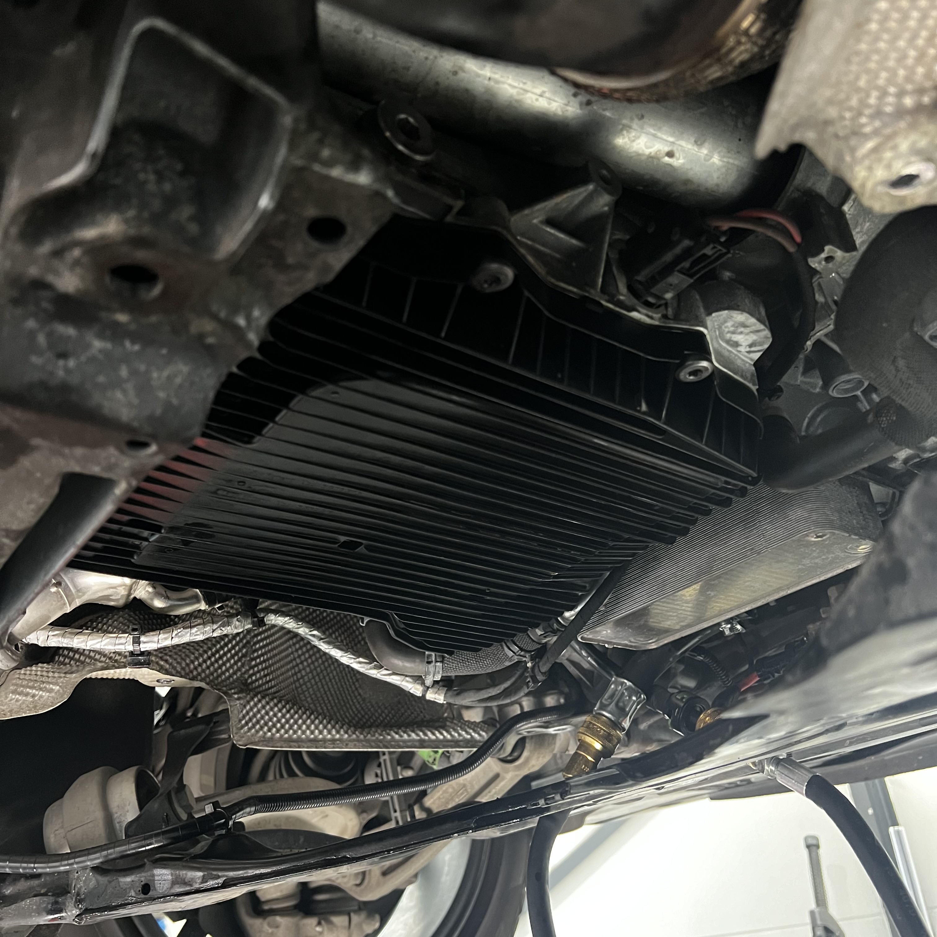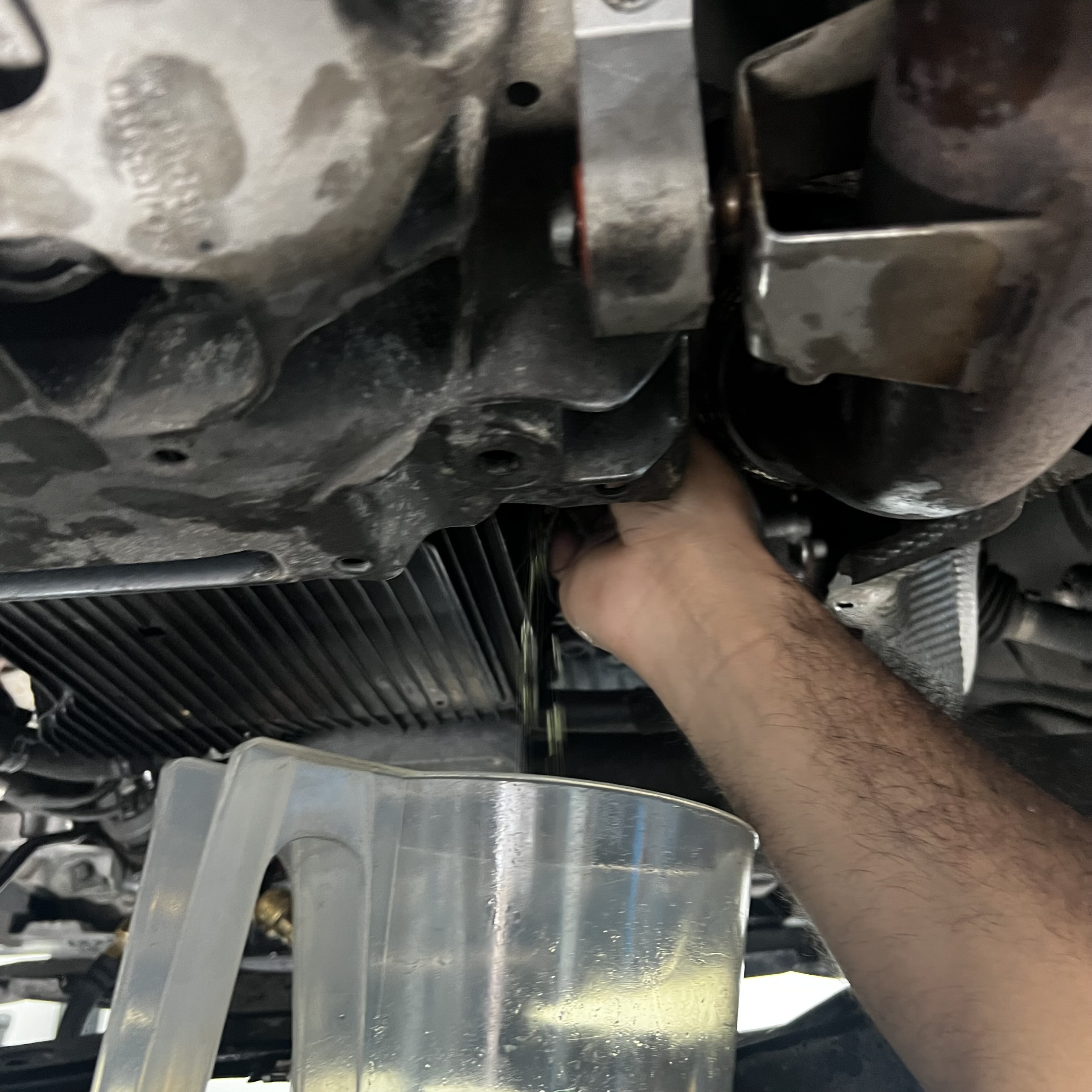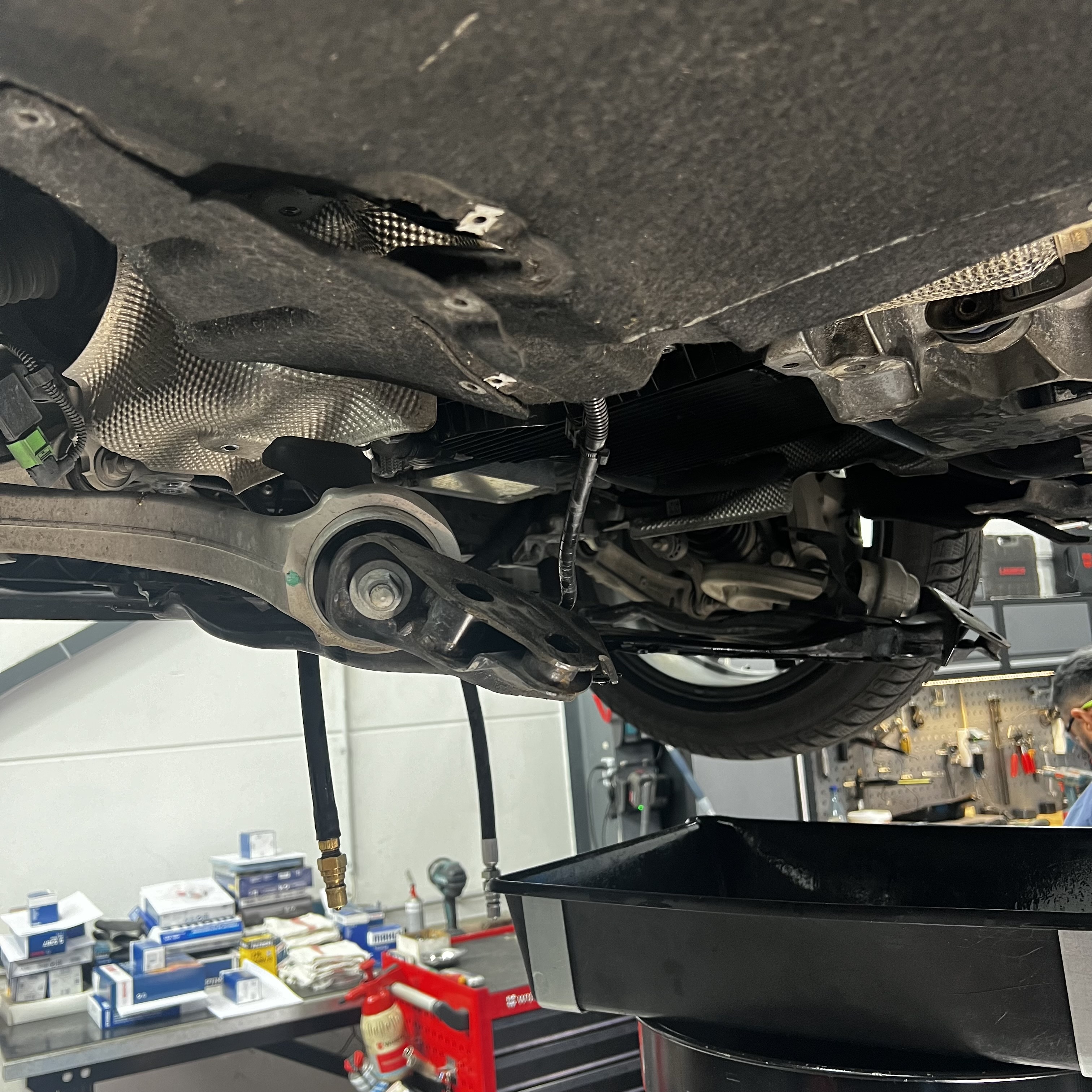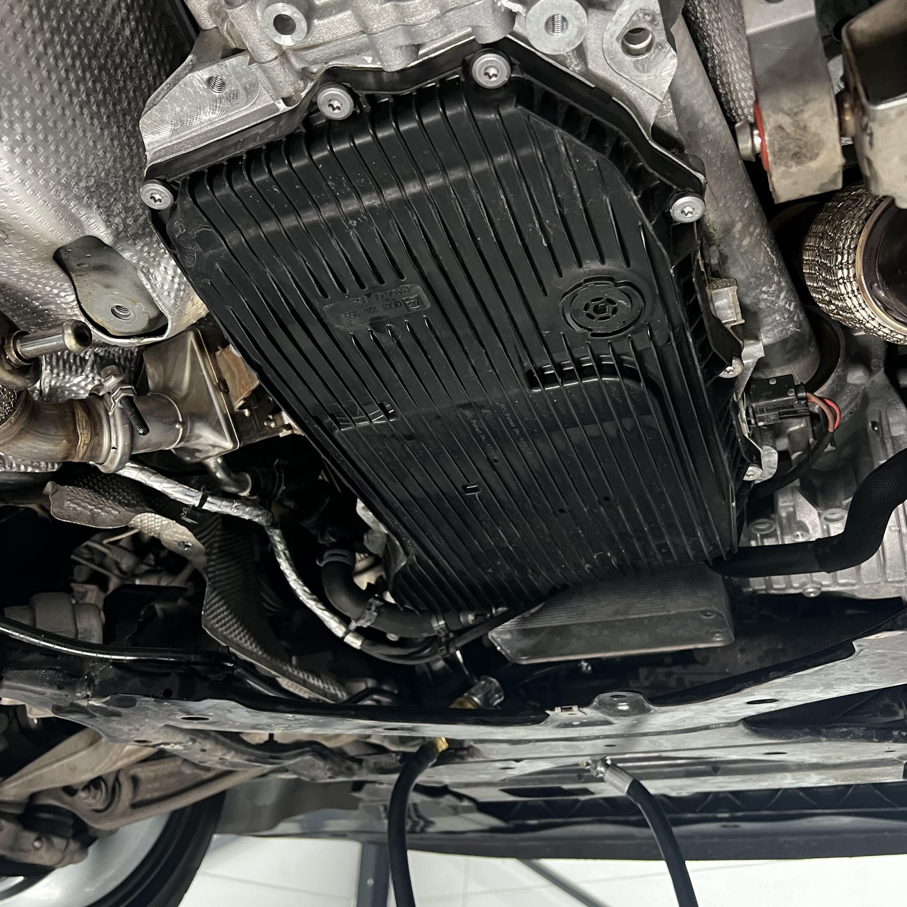 Wir bauen alle notwendigen Teile am Unterboden ab um die Ölwanne zu erreichen damit der Filter getauscht werden kann. Durch die Getriebeölspülung kann eine Frischölquote von gut 97% erreicht werden. Wir benötigen dafür ca. 1,5 Stunden.